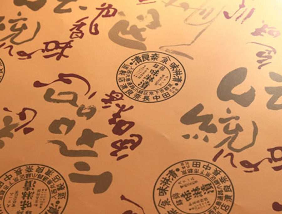 都錦味淋漬の包み紙には、「誠実」「忍耐」「伝統」「香」「色」「味」「心」の文字が躍っております。