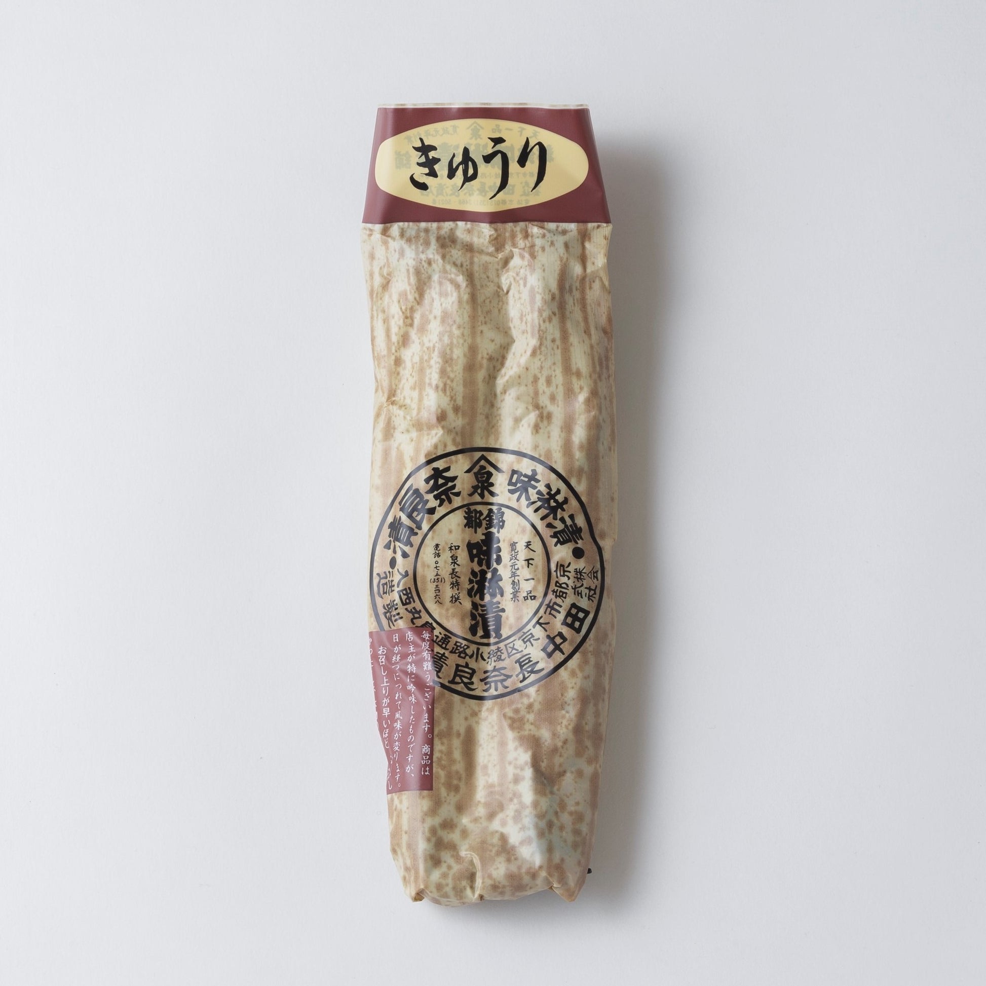 生の状態では濃い緑が特徴で、まっすぐに伸びた国産の良質なきゅうりを厳選し、奈良漬に仕上げました。皮はパリッと歯切れ良く、なめらかな肉質でうりよりも柔らかいのが特徴です。うりとはまた違う、きゅうり独特の風味もお楽しみいただけます。