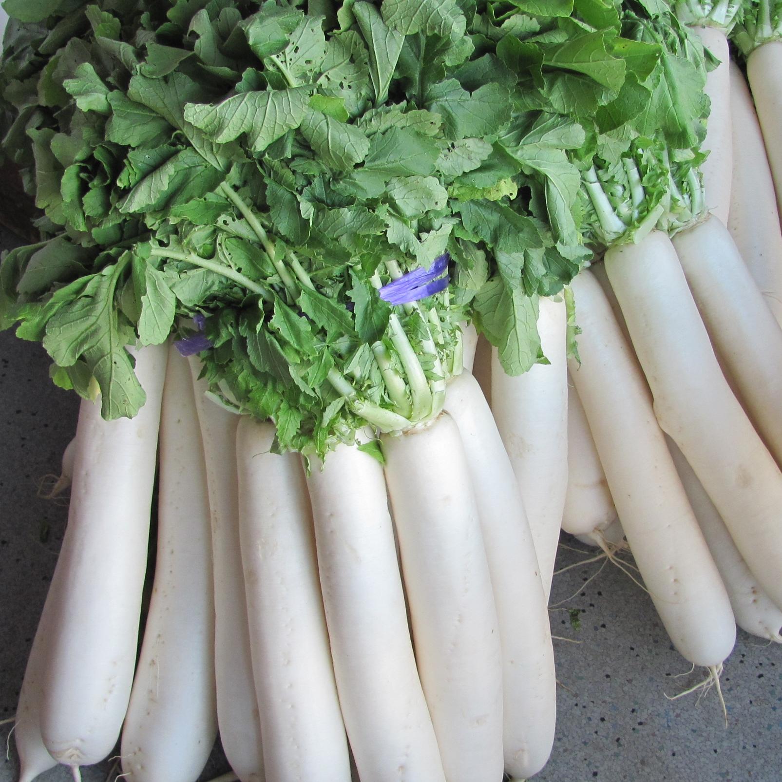 青首大根との大きな違いは、その名のとおり全体が白いこと。その理由は地面から頭を出さずに、深く下に向かって伸びるためです。そのため掘り出すのが難しく収穫は大変な重労働。私たちも時期になりますと収穫のお手伝いに伺います。日頃衛生管理に気を遣う我々も、この時ばかりは全身泥々になりながら作業に当たります。
