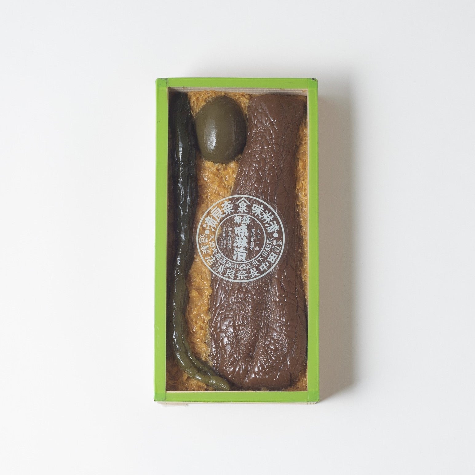 都錦味淋漬に漬上げた野菜を計量して木箱(寸法290x145x65mm)にお詰めしております。 本品は「うり」1本、「すいか」1玉、「きゅうり」1本入りを標準にお造りしています。 ※自然の農作物を原料としている為、詰め合わせ内容が見本と異なる事がありますが、量目には相違ございません。