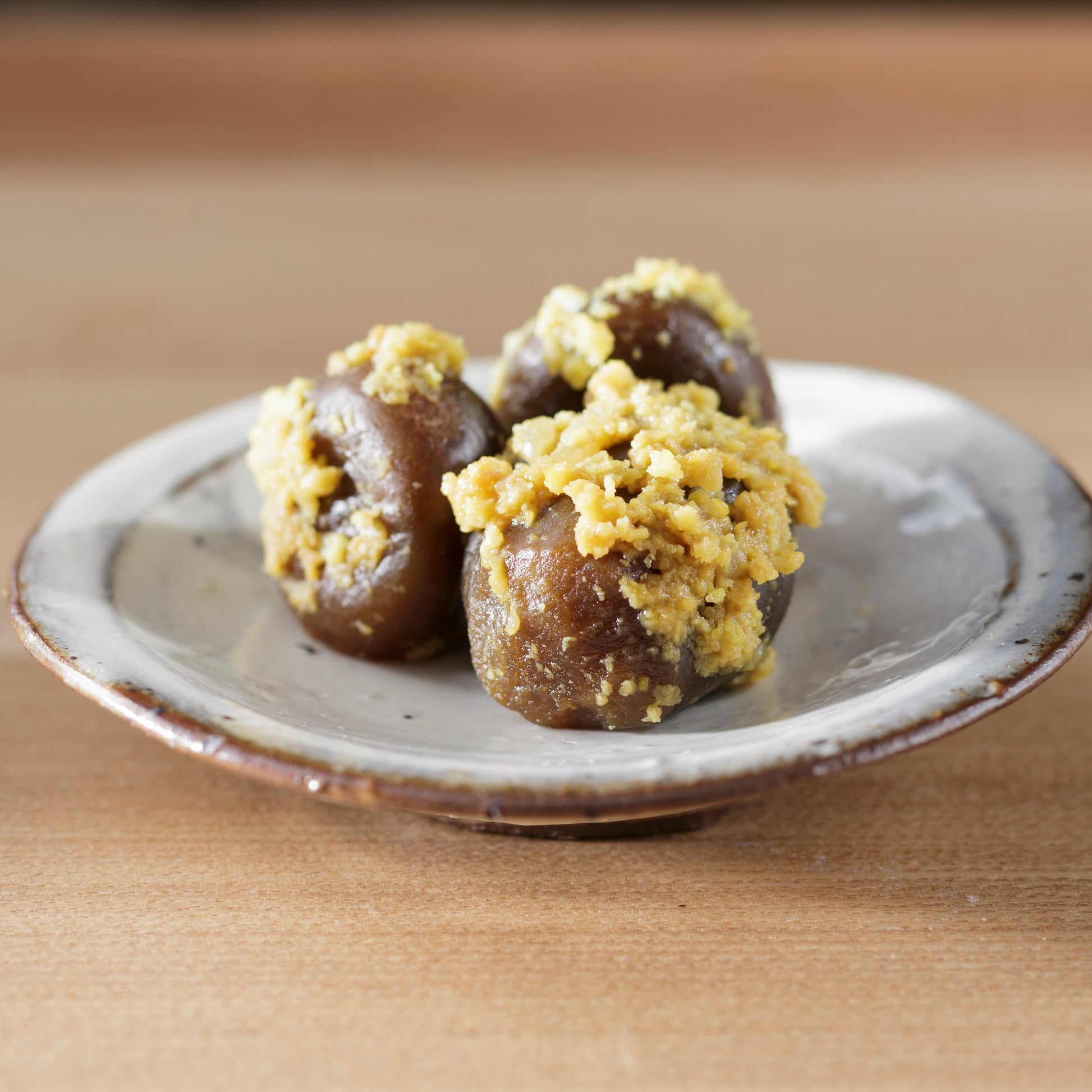 周りの粕は本みりんを絞ったときに出る「みりん粕」、以前はよく「こぼれ梅」と称されおやつとして愛好されていたものです。こちらに和からし、洋からし、糖類などを弊社独自の比率でブレンドし、そこにもぎなすの奈良漬を再度漬け込んだものになります。
